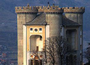 La prima struttura del castello di Aymavilles, che primeggiava in una zona pianeggiante, era costituita da una torre quadrangolare circondata da una cinta muraria. Lo scopo di questa struttura era principalmente difensiva. Nel 1357 Aimone di Challant, feudatario del territorio di Aymavilles, rinforzò la struttura del maniero costruendo quattro torri angolari.